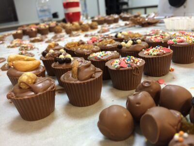 Daarna gingen we aan de slag met de bonbons. We vulden melkchocolade cupjes met ganache, een creme op basis van boter en room. Er waren verschillende smaken ganache: bosvruchten, aardbeien, caramel, butterscotch en pure chocolade. Na het vullen topten we de cups af met melkchocolade en pasten we weer een versiering toe van noten, strooisel of suikerhartjes.